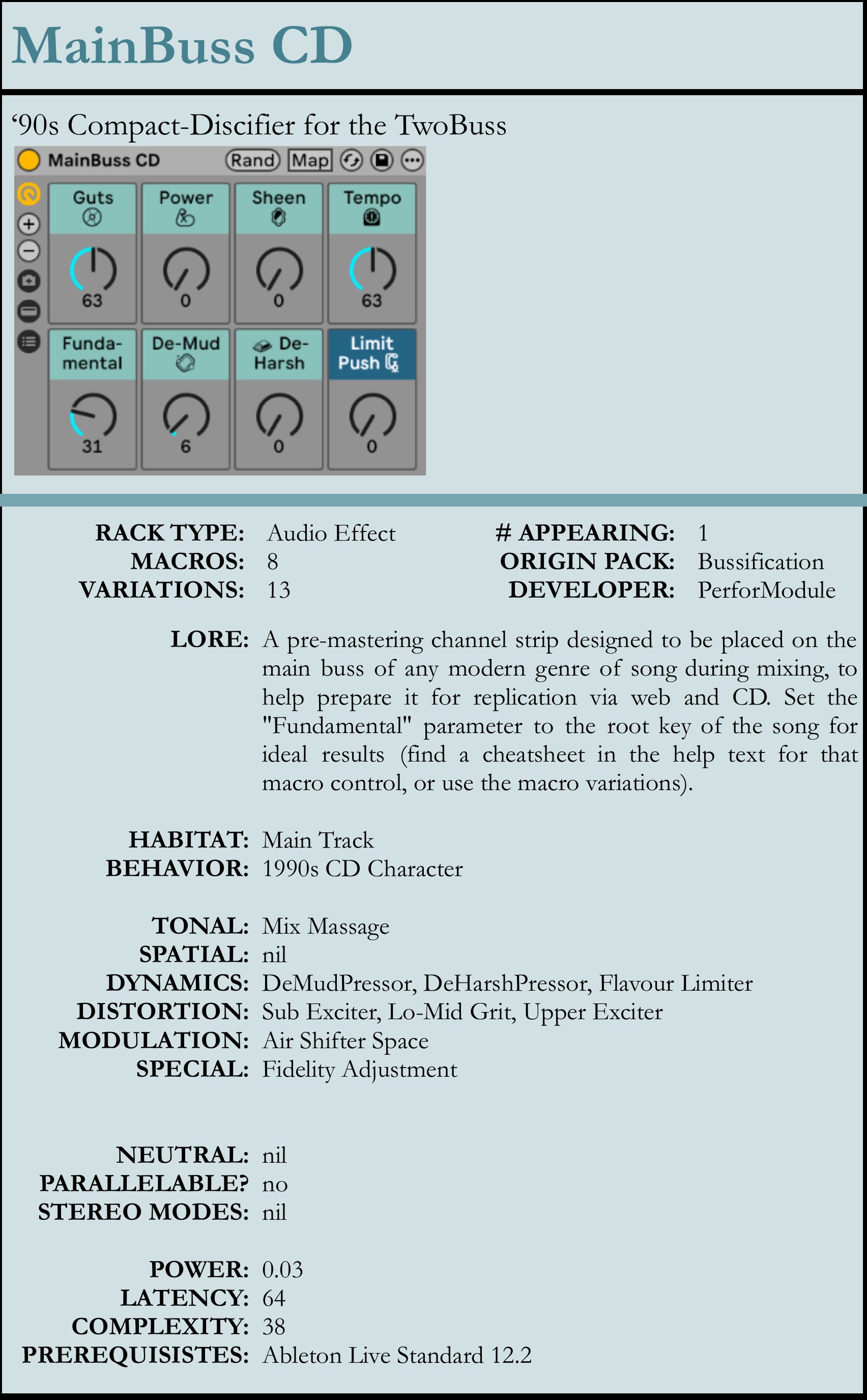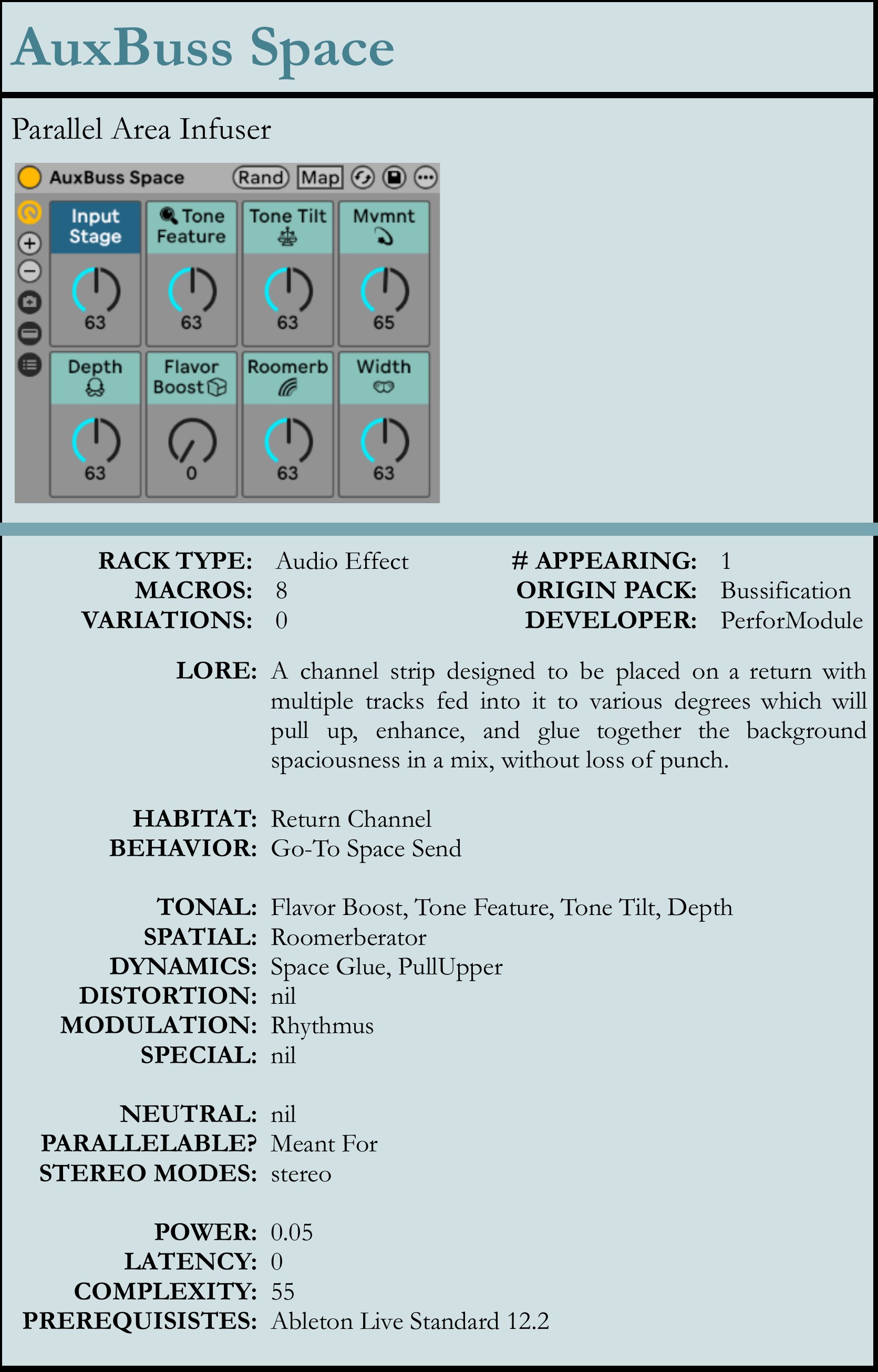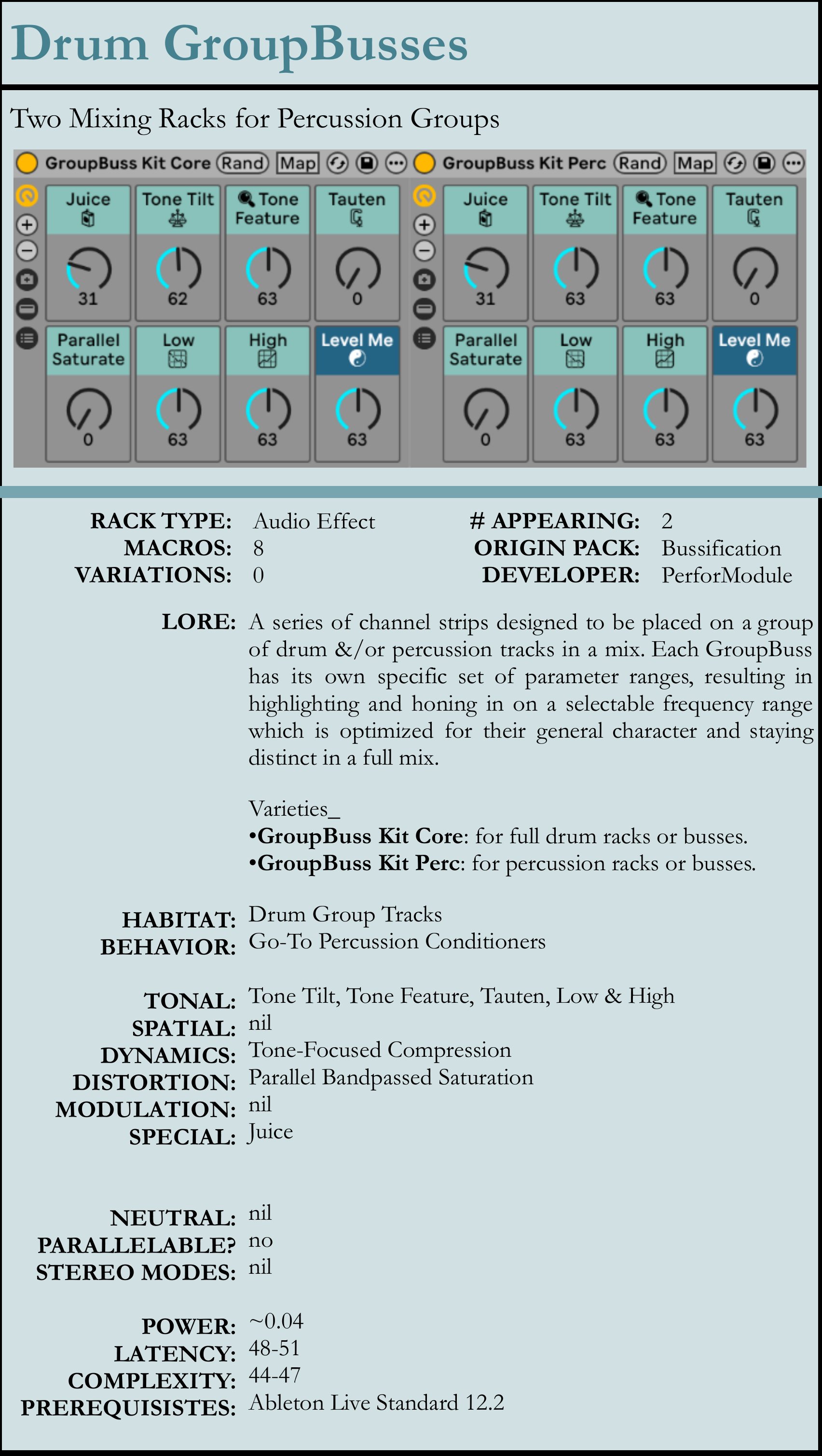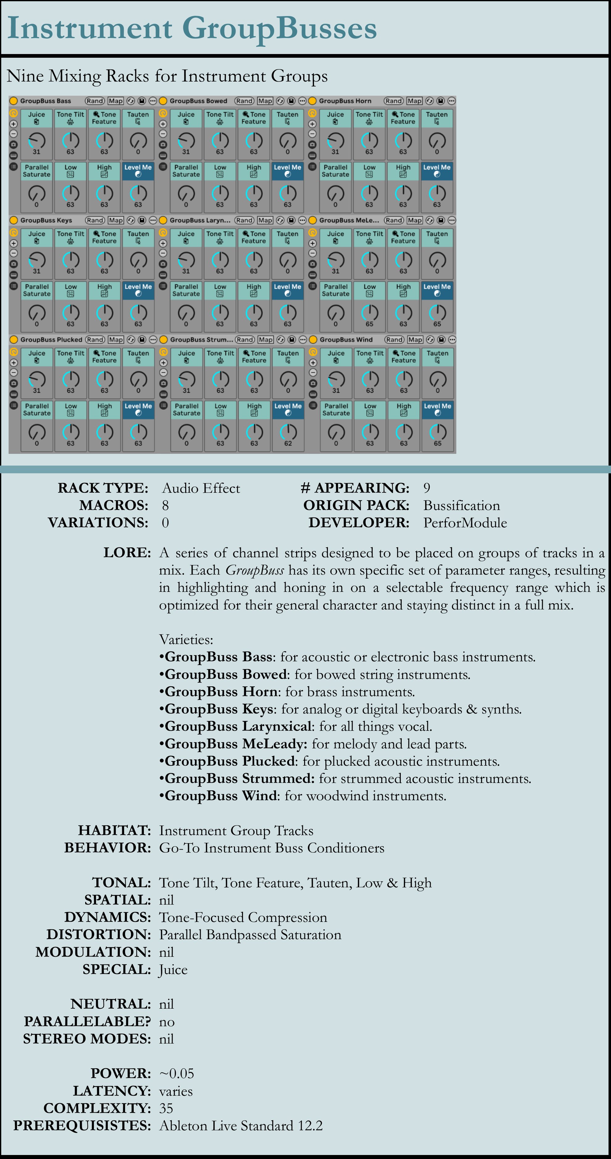 A series of channel strips designed to be placed on groups of tracks, auxiliary busses, and the main channel, each with their own specific set of parameter ranges. ๐ŸšŒ